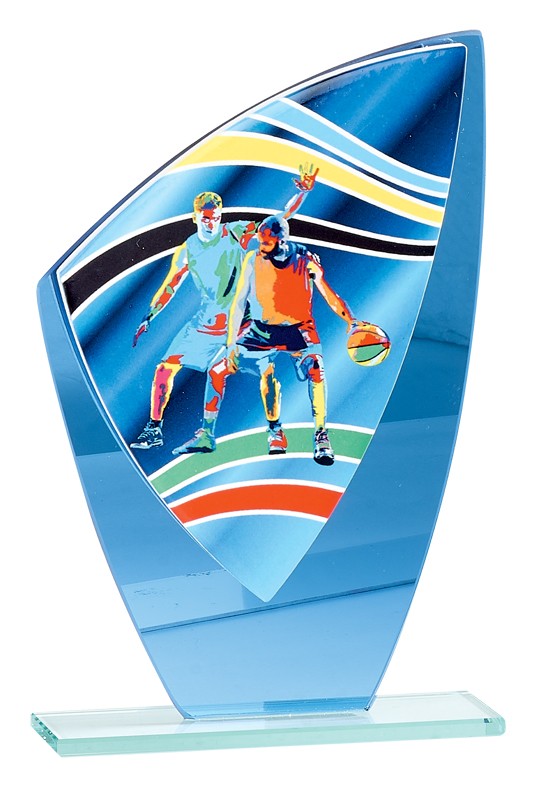 TROPHÉE 3 Hauteurs : 18cm / 20cm / 22cm - Matière du trophée : Verre bleu avec lignes argentées - Matière du socle : Verre transparent - Sujet BJ en bois impression couleur