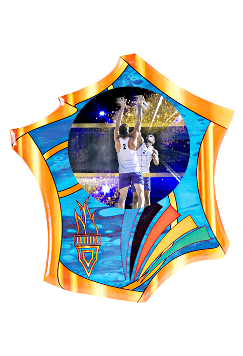 TROPHÉE 3 Hauteurs : 18cm / 20cm / 22cm - Matière du trophée : Verre transparent avec partie dorée et lignes argentées - Matière du socle : Verre transparent - Sujet BJ en bois impression couleur