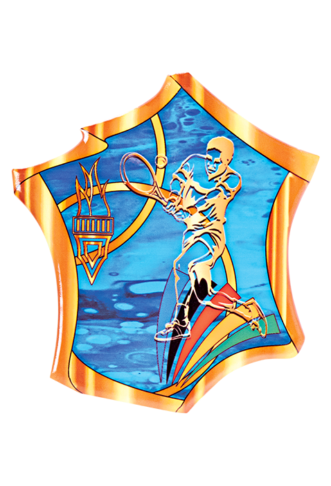 TROPHÉE 3 Hauteurs : 18cm / 20cm / 22cm - Matière du trophée : Verre avec impression couleur - Matière du socle : Verre transparent - Sujet NJ en résine, finition or et argent