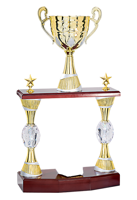 TROPHÉE DOUBLE COLONNE - Hauteur : 53 cm - Matière trophée : Parties synthétique et coupe métal - Base haute et basse : Bois vernis - Figurine résine : Grand choix de disciplines disponibles - Finition : Argent et Or - Personnalisation : Choisir votre activité ou votre Logo après étape 1