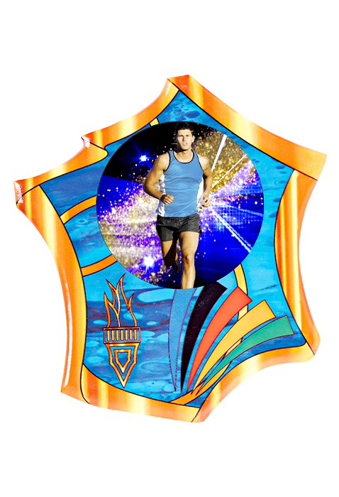 TROPHÉE 3 Hauteurs : 19cm / 21cm / 23cm - Matière du trophée : Verre transparent avec partie dorée et lignes argentées - Matière du socle : Verre transparent - Sujet KW en céramique, finition bleu et or