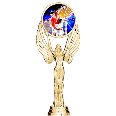 TROPHÉE DOUBLE COLONNE - Hauteur : 42 cm - Matière trophée : Synthétique - Base haute et basse : Bois vernis - Figurine ABS métallisé Or : Grand choix de disciplines disponibles - Finition : Bleu et Or - Personnalisation : Choisir votre activité ou votre Logo après étape 1